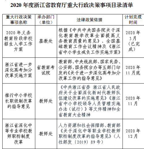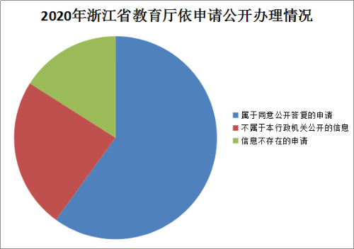 根据《中华人民共和国政府信息公开条例》《国务院办公厅政府信息与政务公开办公室关于政府信息公开工作年度报告有关事项的通知》《浙江省人民政府办公厅关于印发2020年浙江政务公开工作要点的通知》等要求,结合浙江省教育厅2020年政府信息公开工作实际,编制发布本报告。本报告内容包括总体情况,政府信息主动公开情况,政府信息依申请公开情况,政府信息公开行政复议、行政诉讼情况,存在问题和2021年工作计划等5个部分。所列数据的统计期限从2020年1月1日起至12月31日止,报告电子版可通过浙江省教育厅门户网站(http://jyt./)下载。如对本报告有任何疑问,请联系浙江省教育厅办公室(电话:0571-88008769)。 一、总体情况 在省政府办公厅指导下,浙江省教育厅坚持法治政府建设统领,以“公开为常态、不公开为例外”,围绕教育改革发展、重大决策部署、民生关注热点等,扎实推进决策、执行、管理、服务、结果五公开,深化以公开促透明、以透明促发展,为加快教育事业健康发展、办好人民满意教育凝聚共识、汇聚力量、创造环境。 2020年,浙江省教育厅通过门户网站及时、主动公开发布各类信息1914条,其中规范性文件10件,工作动态194条,图文报道91条,媒体关注468条,各类公文410条,重点领域信息79条,公告公示85条,其他信息575条。 2020年,浙江省教育厅共受理依申请信息公开25件,其中当面申请0件、信函申请5件、网络申请20件,主要涉及教育经费、学术政策、高校招生等方面的内容。浙江省教育厅所有的依申请公开政府信息都已在《中华人民共和国政府信息公开条例》规定的期限内完成,并以申请人要求的方式答复。其中属于已主动同意公开答复的申请15件,占60%;本机关不掌握相关政府信息的10件,占40%。 (一)加大决策部署公开。健全科学、民主、依法决策机制,出台《浙江省教育系统重大行政决策事项基本目录》《2020年度浙江省教育厅重大行政决策目录清单》,加强重大行政决策目录化管理和公开工作,进一步强化对行政权力的制约和监督,推动依法全面规范履职。坚持教育重大行政决策事项必须依法严格落实公众参与、专家论证、风险评估、合法性审核、集体讨论决定等程序,确保程序正当、过程公开。2020年,通过官网面向社会征求《浙江省校外培训行业信用评价管理办法(试行)》《高水平推进浙江教育治理现代化的实施意见》《浙江省深化产教融合推进职业教育高质量发展的实施方案(2020-2025)》等意见共计14次。对义务教育“公民同招”政策、普通高中课程选用、杭州外国语学校招生改革等重大行政决策进行风险评估。出台《浙江省教育厅关于公布行政规范性文件清理结果的通知》《浙江省教育厅 浙江省消防救援总队关于印发<浙江省学校消防安全管理办法(试行)>的通知》《浙江省教育厅 浙江省人力资源和社会保障厅关于深化浙江省中等职业学校教师职称制度改革工作的通知》等10个规范性文件,做到规范性文件与政策解读材料同步发布,进一步丰富解读形式、提高解读质量。做好行政规范性文件立废改工作,完成教育系统有碍统一市场和公平竞争的政策清理。