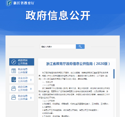 (五)加强政府信息管理。严格按照《中华人民共和国政府信息公开条例》部署要求,落实办公室作为厅机关政务公开工作的职能处室,强化力量支撑,明确职责分工,层层压紧责任。对照浙江省人民政府办公厅《关于印发2020年浙江省政务公开工作要点的通知》、《关于规范政府信息公开平台建设有关事项的通知》等规定,配套完善各项内部管理规章制度,修订2020年主动公开目录,确定年度公开工作要点,优化公开工作流程,不断提高政务公开的质量、效率。 (六)健全监督保障机制。将政务公开工作纳入高校、市县教育局及厅机关内设机构、直属单位等的年度目标责任制考核,印发《浙江省高校信息公开工作指引(试行)》,加强全省教育系统政务公开工作考核机制,确保政务公开工作落到实处。强化对高校和市、县(市、区)教育行政部门政务公开工作的指导和督查,利用培训班等,加强业务沟通,督促各地各校按规定编制主动公开目录,着力提升教育系统政务公开工作标准化规范化水平。 二、政府信息主动公开情况