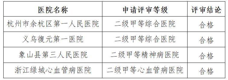 根据《浙江省医院评审办法》,省卫生健康委组织省医院评审专家委员会对杭州市余杭区第一人民医院等4家医院进行了等级评审,现将评审拟定结论公示如下: