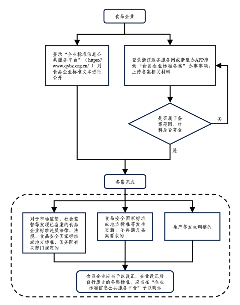 (二)提升备案工作服务效率。我省食品生产企业可登录浙江政务服务网或浙里办APP搜索“食品企业标准备案”办事事项进行线上办理备案,公众可登录“浙江省食品企业标准备案信息系统”(https://spaqbz.wsjkw./zjfsdata/html/pt.htm)免费查阅、下载。各市卫生健康行政部门仅对食品企业标准是否属于备案范围、资料是否齐全进行确认。